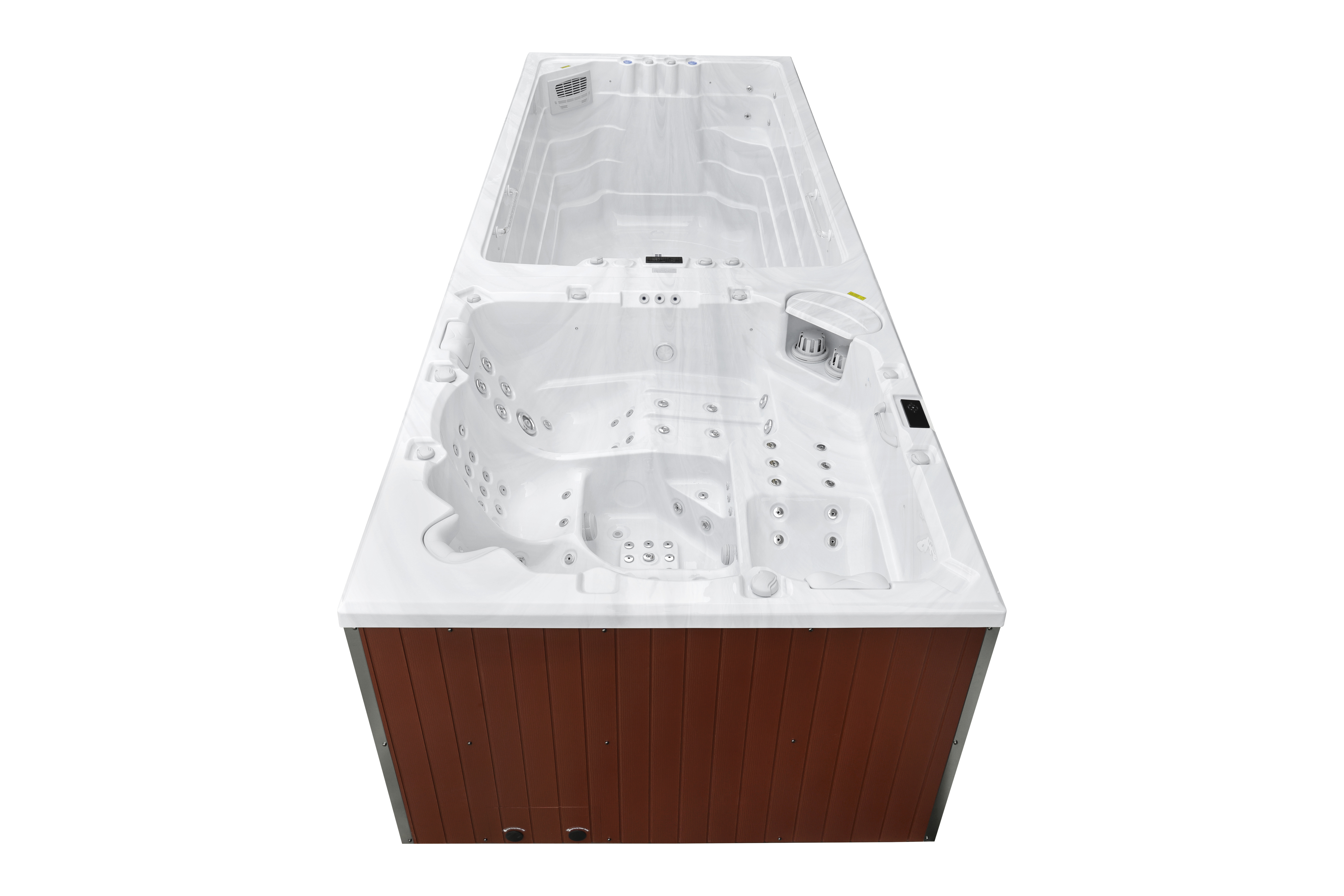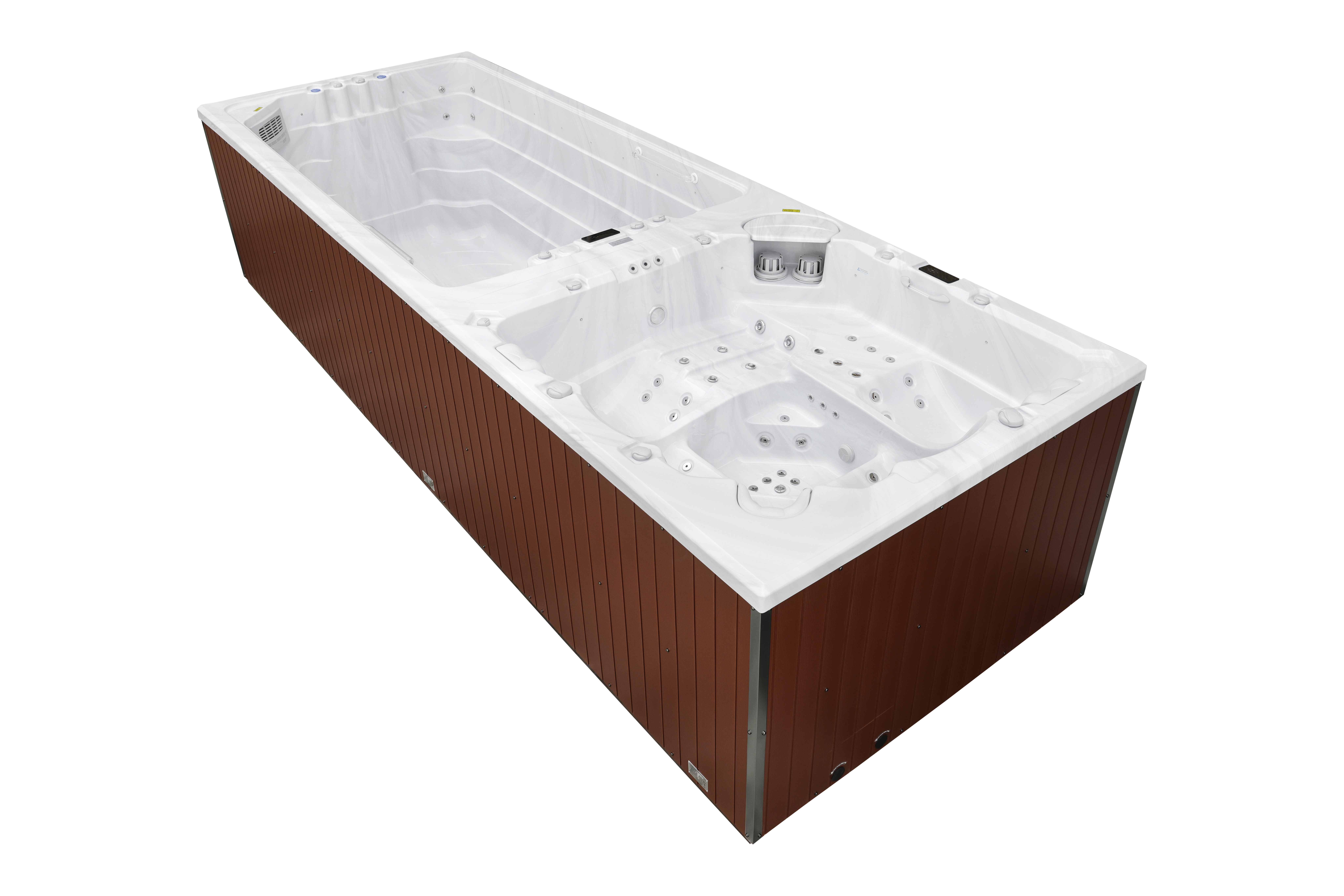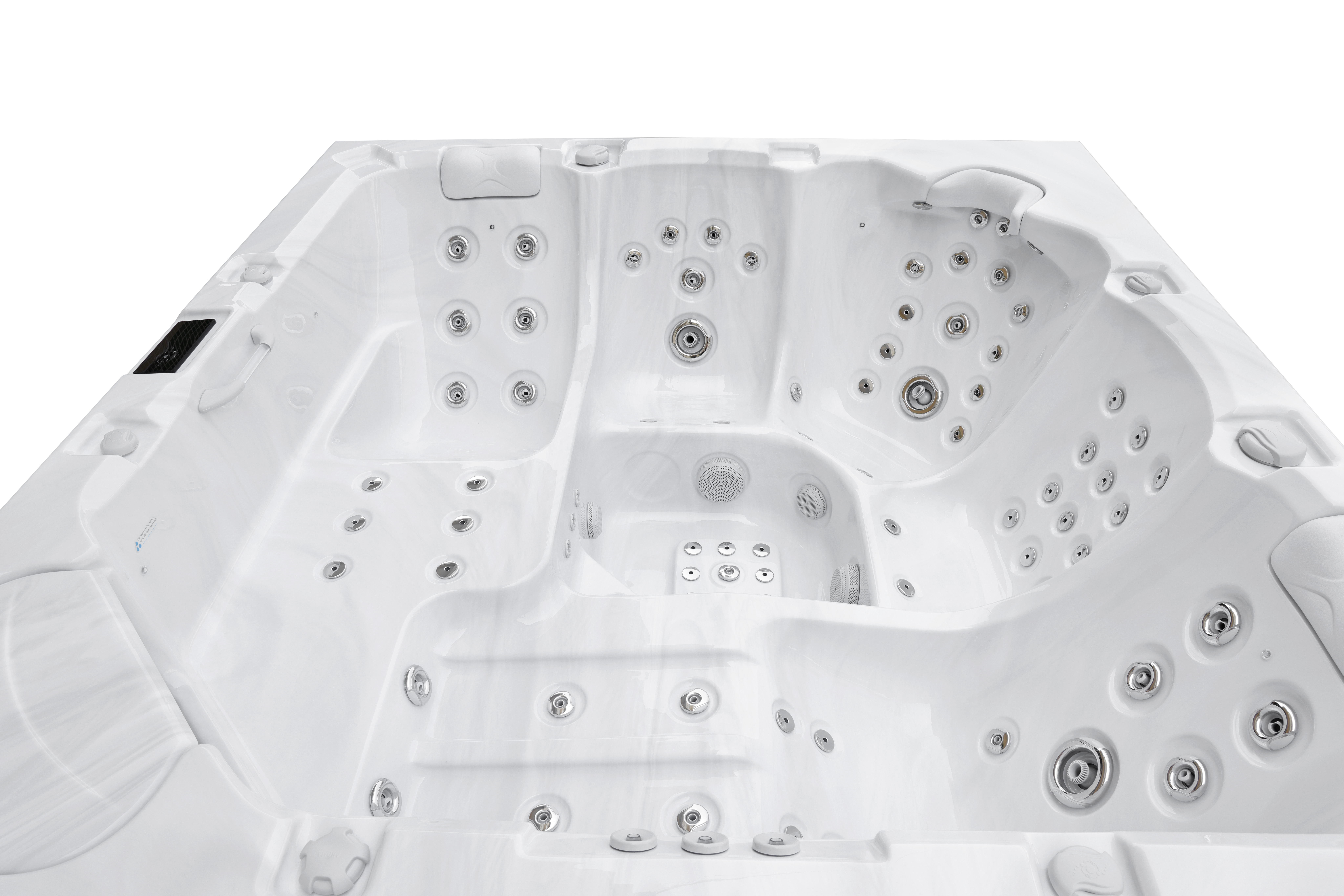 Четыре мощных насоса (два по 2,2 кВт, один 2,2 кВт и один 2,9 кВт) работают в разных зонах, обеспечивая интенсивный массаж 92 форсунками. Уникальная конфигурация гарантирует мощные водные потоки для эффективного массажа и комфортного плавания.